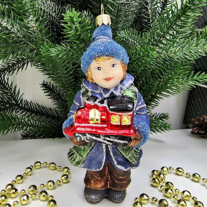 Стеклянная елочная игрушка Мальчик с паровозиком