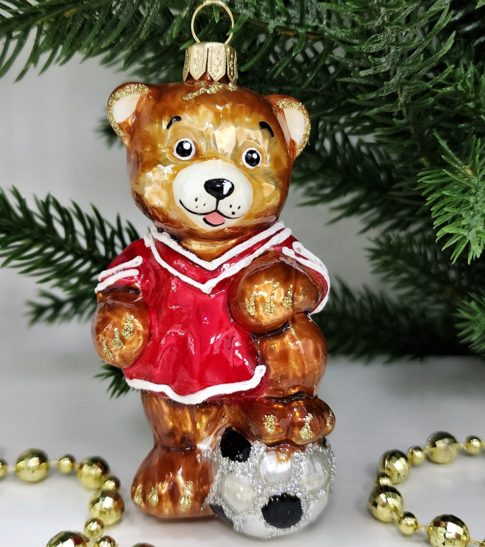 Стеклянная ёлочная игрушка "Мишка футболист девочка" от Irena Co - это уникальное украшение для вашей новогодней елки.