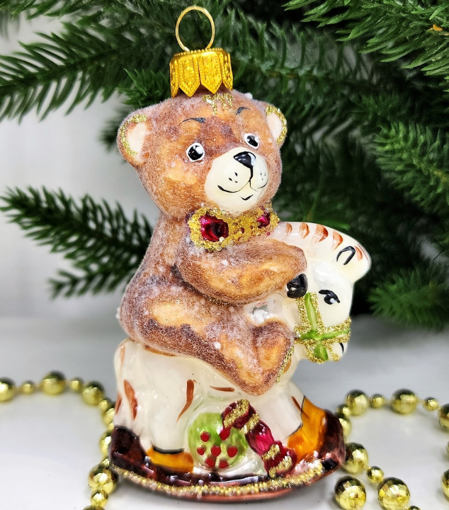 Стеклянная елочная игрушка Мишка на лошадке качалке