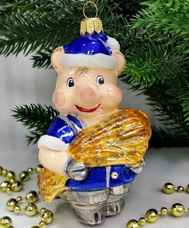 Стеклянная елочная игрушка Поросенок с сеном