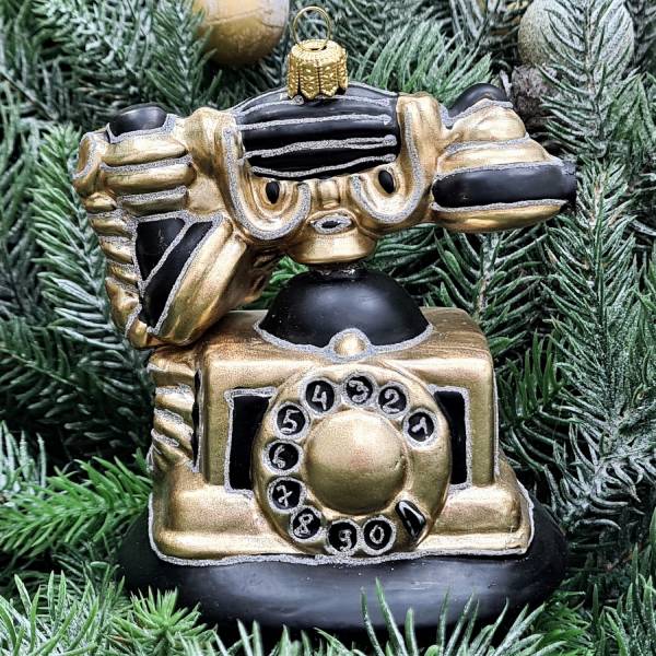 Стеклянная елочная игрушка Ретро телефон черный с золотом
