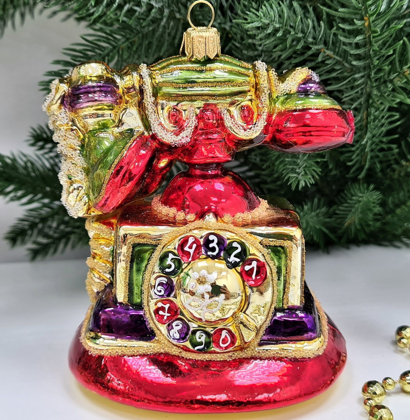 Игрушка выполнена в виде ретро телефона красного цвета, который усыпан блестками и выполнен в яркой расцветке. Такой дизайн точно не останется без внимания и добавит праздничного настроения на вашем новогоднем дереве.