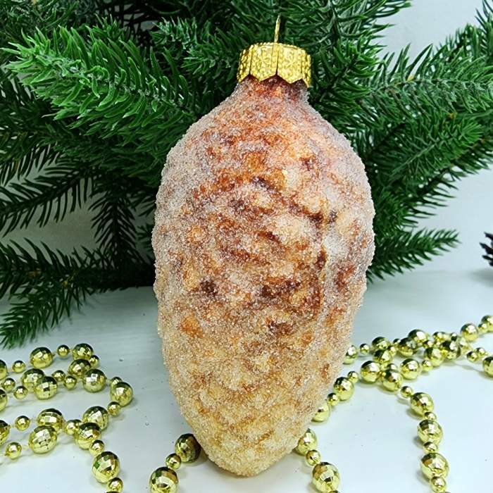 Изготовленная из прозрачного стекла, игрушка имеет светло-коричневый оттенок, который гармонично вписывается в праздничный интерьер. Мелкие кристаллики сахара, покрывающие поверхность, создают эффект инея, делая шишку еще более реалистичной.