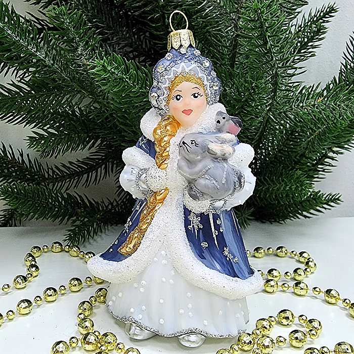Стеклянная ёлочная игрушка Снегурочка с зайкой и птичкой – это уникальное украшение, которое станет прекрасным дополнением к вашей новогодней елке.