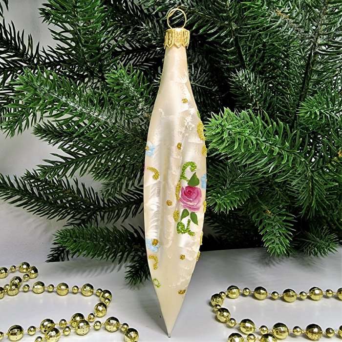 Игрушка выполнена из стекла, что придает ей особую изящность и хрупкость. Ручная роспись добавляет уникальности и делает каждую игрушку неповторимой.