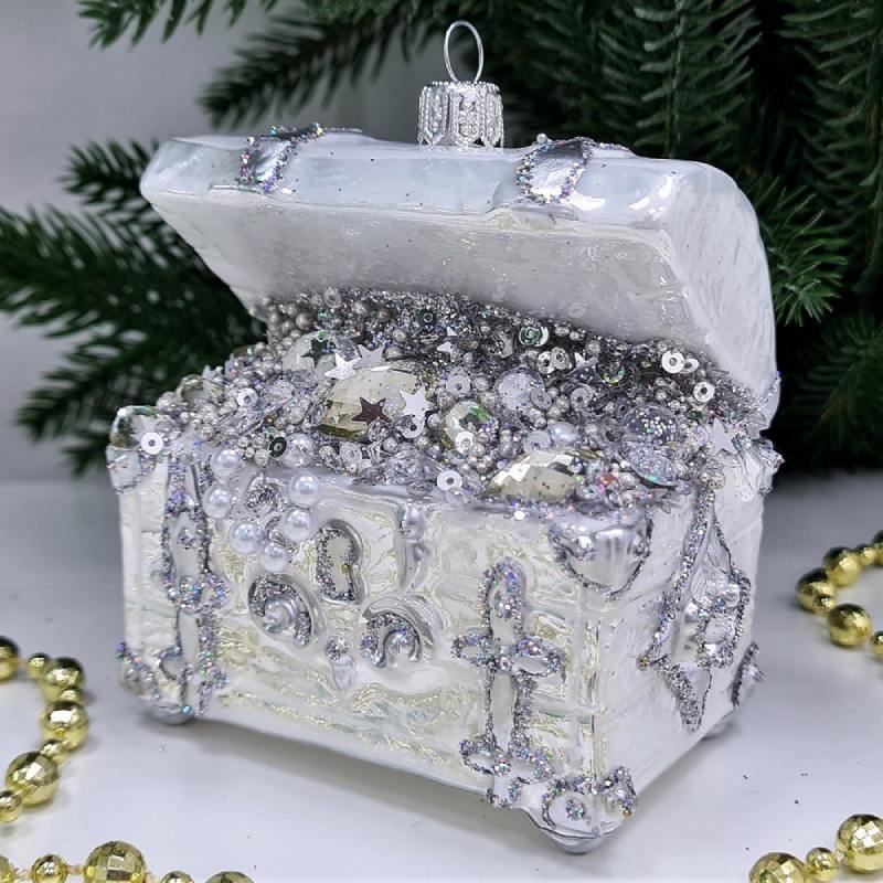 Стеклянная ёлочная игрушка Сундук с золотом серебро - это не просто украшение, это символ богатства и роскоши, который привнесет в ваш дом атмосферу праздника и волшебства.